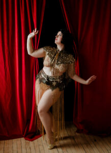 Wickedly whimsical showgirl of Dayton’s Gem City Burlesque, Aurora Maur, has performed burlesque for over a decade ! She has shimmied her way across stages from the MidWest over to both coasts and beyond the US. She is over the moon to be sharing her love and admiration for veil dance with the QOTWBF community. Her hope is to inspire more performers to work with this stunning and simple prop!